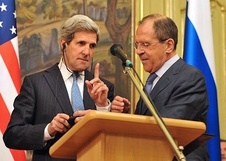 John Kerry et Sergeï Lavrov à Moscou, le 7 mai. Les deux hommes s’accordent sur la nécessité de parvenir à une solution politique au conflit syrien, mais s’opposent toujours sur ses préconditions (crédit photo : Mladen Antonov/AFD).