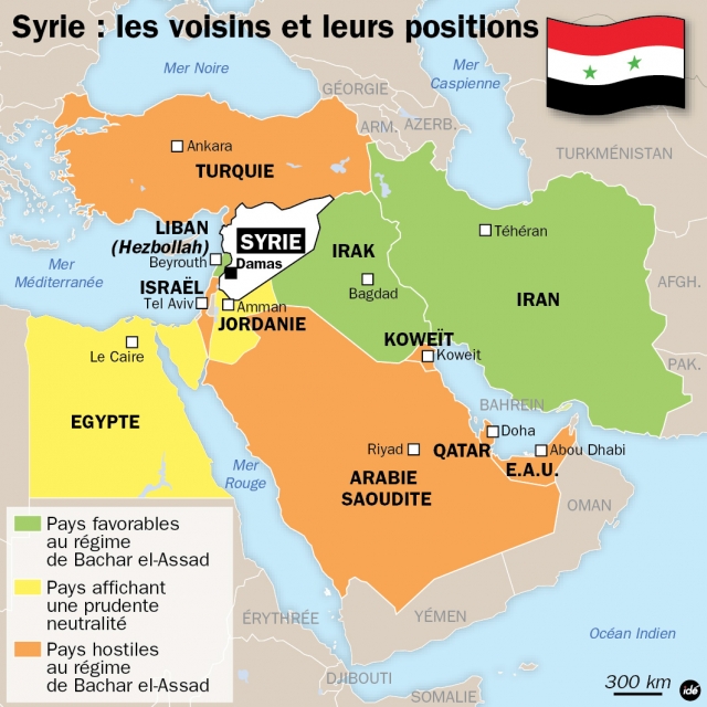 Infographie représentant la position des pays de la région vis-à-vis de la Syrie. Israël y est classé parmi les « pays hostiles à Damas », mais, contrairement à la Turquie, à l’Arabie saoudite et au Qatar, les discours officiels de l’État hébreu sont, pour le moment, empreints d’une « neutralité prudente », conditionnée par l’attitude du régime syrien : Israël enjoint Damas de s’abstenir de toute riposte contre son territoire qui le ferait intervenir dans le conflit. (Conception : Agence « IDÉ »).