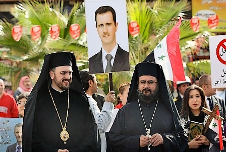 Un comité d’accueil de l’église orthodoxe syrienne s’apprêtant à recevoir le patriarche Cyrille 1er de Moscou et de toute la Russie,venu réitérer son soutien à Bashar al-Assad (Photo AFP/Louai Beshara)
