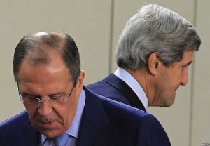 Photo prise lors du sommet des ministres des affaires étrangères de l’OTAN, à Bruxelles, le 23 avril 2013. Au premier plan, le chef de la diplomatie russe, Sergeï Lavrov, et derrière lui, son homologue américain John Kerry (photo : Reuters).