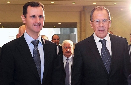 Le président syrien Bachar al-Assad (gch.) et le ministre russe des Affaires étrangères, Sergeï Lavrov, réunis lors d’une rencontre à Damas en février 2012. Derrière eux, au milieu, le ministre syrien des Affaires étrangères, Walid al-Mouallem. Depuis le début du conflit, la ligne de la Russie n’a pas bougé d’un iota. Elle plaide pour un arrêt du conflit sans précondition, refusant l’exigence principale de l’opposition et de Washington qui est le départ préalable du président syrien (Photo: REUTERS/SANA).