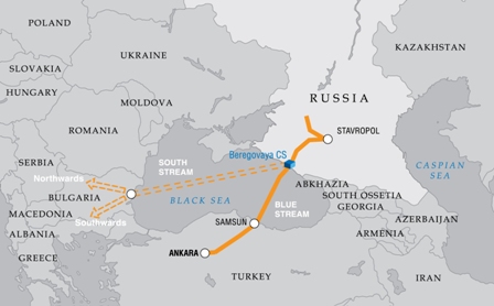 Carte représentant le tracé du gazoduc « Blue stream » transportant du gaz de la Russie à la Turquie (source : site web Gazprom)