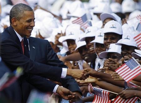 Le président Barack Obama saluant des Tanzaniens lors de la cérémonie officielle de bienvenue en son honneur, à Dar es-Salaam, le 1 juillet 2013. (Photo : Reuters/ Gary Cameron).