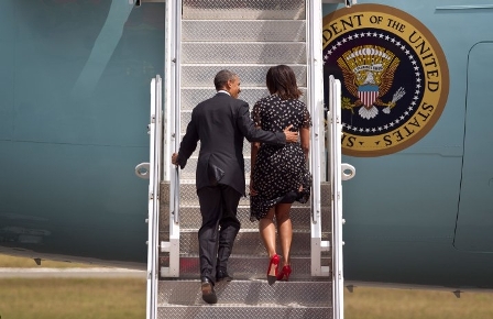 Le président Obama et son épouse embarquant à bord de l’avion présidentiel Air Force One à l’aéroport Julius Nyerere de Dar es-Salaam, en Tanzanie, à la fin de la dernière étape de leur visite d’une semaine en Afrique. (Photo : AP/ Ben Curtis)