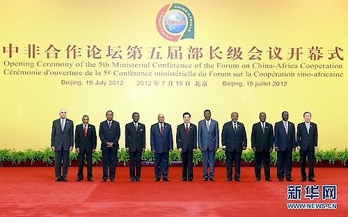L’ex président chinois Hu Jin Tao, en présence de neufs dirigeants africains et du SG de l’ONU, Ban Ki Moon à la cinquième Conférence ministérielle du Forum sur la coopération sino-africaine le 19 juillet 2012. Photo : © Xinhua