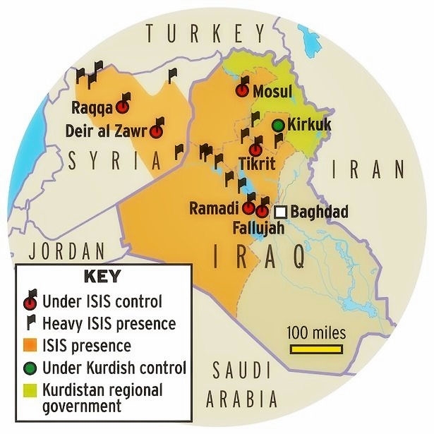 Aperçu de l'étendue de la présence de l'EIIL/EI (ISIS ou ISIL en anglais). Le chef de l'organisation, Abu Bakr-al-Baghdadi, a proclamé la création d'un "califat" qui s'étend des territoires syriens du nord-ouest d'Alep à ceux de l'ouest de l'Irak (Ninive et une partie d'Al-Anbar). En Syrie, de nombreuses villes ont été conquises par l'EI, dont Rakka près de la frontière turco-syrienne où se trouve sa base principale et Deir el-Zor (Nord-Est) qui concentre de nombreux champs pétroliers. Cette manne financière et la prise de matériels lourds à l'armée irakienne ont favorisé son essor spectaculaire ces dernières semaines. En Syrie, l'EI veut asseoir son hégémonie, au détriment des autres groupes rebelles et jihadistes dont son principal rival, le front Al-Nosra, fidèle à Ayman al-Zawahiri (leader numéro un d'Al Qaïda) et qui a perdu le contrôle de plusieurs territoires à cheval entre la Syrie et l'Irak, au terme d'âpres et sanglants affrontements entre jihadistes qui semblent être en voie d'intensification. Carte : GlobalSecurity.org