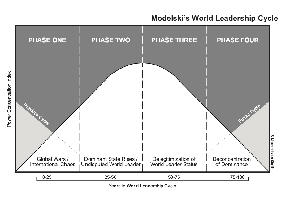 Le leadership en géopolitique s’appréhende comme une réalité dynamique (le titre de leader passant d’un pays à l’autre au cours des siècles). Le "Cycle du leadership mondial" de G. Modelski constitue une sorte d’équivalent géopolitique du cycle économique de Kondratiev, mais il est plus long (correspond à deux cycles économiques successifs). Le cycle de Modelski dure entre 100 et 120 ans et se divise en 4 phases de 25 ou 30 ans. Crédit graphique : ian.muehlenhaus.com