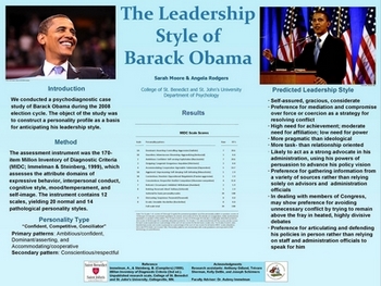 Une étude menée par le département de psychologie du College of Saint Benedict and Saint John University (Minnesota) avait permis d’anticiper le style de leadership de B. Obama sur la base de son profil psychologique durant la campagne de 2008. Ce modèle prédictif le dépeint comme un « conciliateur confiant », un meneur ambitieux, doté d’une bonne dose de narcissisme adaptatif et d’une tendance à l’accommodation plus forte que chez la plupart des présidents. Les déductions révèlent une très haute confiance en ses propres idées et un vif désir de transformer la société. Une volonté et un activisme tempérés par une tendance à agir en bâtisseur de consensus et en arbitre au sein de son administration et entre les lignes partisanes. Infographie et détails de l’étude disponibles sur le site : http://www.immelman.us/news/barack-obamas-presidential-leadership-style