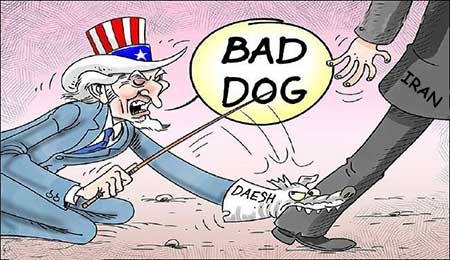 Caricature qui illustre la thèse défendue par le camp pro-iranien selon laquelle l’Amérique était informée des projets de l’EIIL et l’aurait laissé faire voire soutenu, à travers ses alliés saoudiens, turcs, qataris et kurdes irakiens. pouvait avoir été surprise par la montée en puissance de l’EIIL, au regard de l’importance des moyens que la prise de Mossoul. L’EIIL serait un « plan B » par lequel Washington espère tirer des dividendes politiques et les exploiter contre l’Iran et ses alliés.