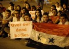 Sur la photo : des manifestants syriens rassemblés le 13 septembre 2013 à Damas, tenant des banderoles et drapeaux lors d’un sit-in organisé contre le projet d’action militaire américaine. (crédit : AFP – Anwar Amro).